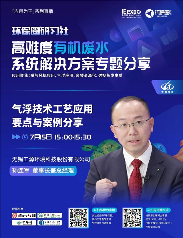 本場直播由工源環(huán)境董事長兼總經(jīng)理孫連軍先生——擁有近30年環(huán)保行業(yè)從業(yè)經(jīng)驗的環(huán)保人,親自為您講解氣浮技術(shù)工藝應(yīng)用要點,并帶來大量現(xiàn)場應(yīng)用實例展示,如果您的項目有提標除磷、河湖水體除藻治理、高濃廢水(廚余垃圾、屠宰、養(yǎng)殖、垃圾滲濾液、化工廢水等)這些困擾,更不能錯過本場直播!