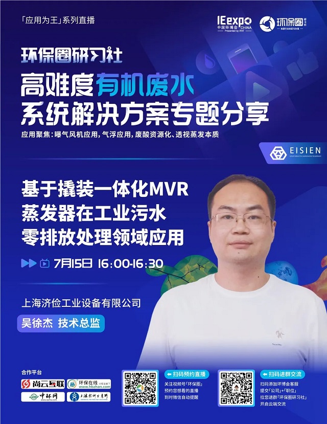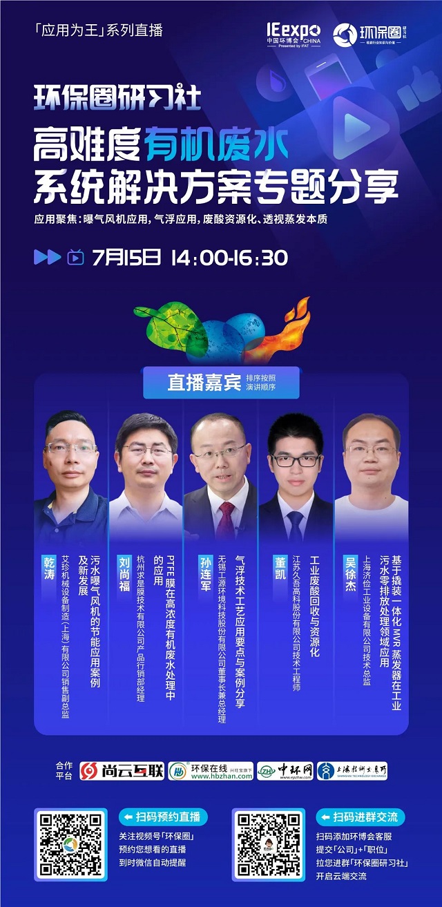 7月15日(星期五)下午14:00-16:30,環(huán)保圈研習(xí)社“應(yīng)用為王”系列直播高難度有機廢水系統(tǒng)解決方案專題分享,有幸邀請到了艾珍機械、求是膜、工源環(huán)境、久吾高科、上海濟儉5家企業(yè)的技術(shù)專家做客直播間,與我們共同探討“水環(huán)境”污染處理問題,并為大家?guī)砀唠y度有機廢水的節(jié)能處理、資源化利用、零排放處理等相關(guān)技術(shù)及解決方案分享。