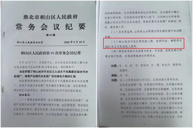 偏偏相山區(qū)一點(diǎn)也不急,嘴上喊著已經(jīng)在走流程了,其實(shí)是2020年9月才研究部署食品工業(yè)園污水處理廠建設(shè)工作,并且相關(guān)工作僅停留在文件上,直至本次督察進(jìn)駐前夕,相山區(qū)才再次啟動污水處理廠的建設(shè)工作,目前尚處于項(xiàng)目土地報(bào)批階段。