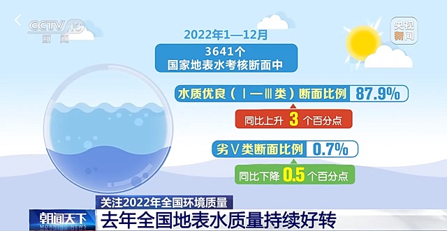 2022年1—12月,3641個國家地表水考核斷面中,水質(zhì)優(yōu)良(Ⅰ—Ⅲ類)斷面比例為87.9%,同比上升3個百分點;劣Ⅴ類斷面比例為0.7%,同比下降0.5個百分點。