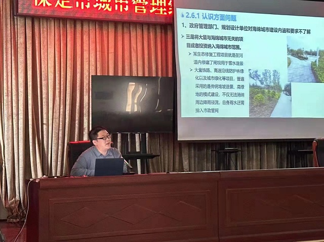 接著,馬洪濤教授針對(duì)規(guī)劃是基礎(chǔ),構(gòu)建全面科學(xué)的海綿城市規(guī)劃體系;方案是指引,編制合理系統(tǒng)的海綿城市實(shí)施方案;項(xiàng)目是根本,做好科學(xué)合理的海綿城市設(shè)計(jì)方案;機(jī)制是基礎(chǔ),構(gòu)建完整可行的海綿城市推進(jìn)機(jī)制;模式是保障,選擇綜合統(tǒng)籌的海綿城市建設(shè)模式;交流是助力,形成通俗易懂的海綿城市語(yǔ)言體系等方面,結(jié)合其他城市建設(shè)經(jīng)驗(yàn),針對(duì)保定實(shí)際,做了深入淺出、通俗易懂的細(xì)致講解。