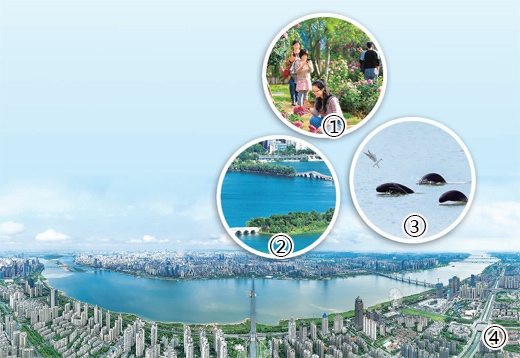 圖①:市民在濱江月季園游玩。馬悅 攝 圖②:象湖濕地公園。馬悅攝 圖③:在贛江水域嬉戲的江豚。余會(huì)功攝 圖④:穿南昌城而過(guò)的贛江。