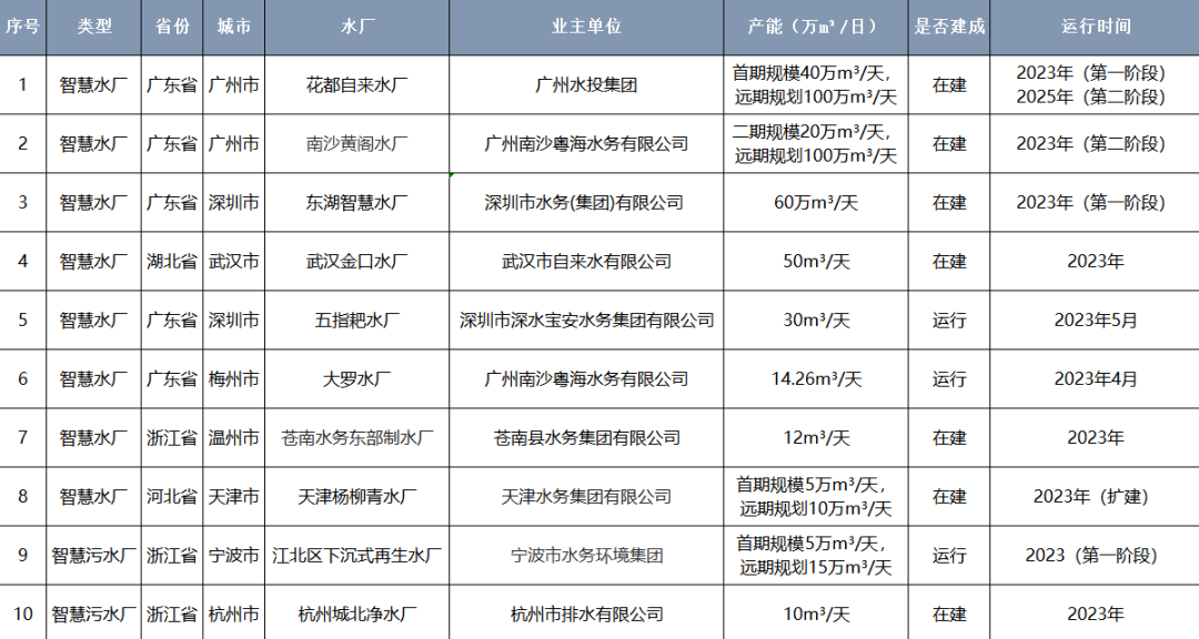 水務加對2023年上半年國內新建或升級改造的智慧水廠、智慧污水廠進行了盤點,其中智慧水廠共8家,智慧污水廠共2家,詳情如下 (按產能進行排序):