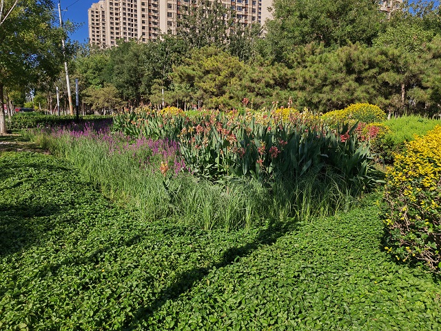 搖曳的美人蕉、綻放的千屈菜、翠綠的馬藺……這些植被在點“靚”環(huán)境的同時,也承擔(dān)起了輔助調(diào)蓄和凈化徑流雨水等實際功能。自2016年4月,天津市獲批國家第二批海綿城市建設(shè)試點以來,天津高新區(qū)持續(xù)推進(jìn)海綿城市建設(shè)走向縱深,渤龍湖科技園綠地海綿改造項目建設(shè)已取得顯著進(jìn)展。