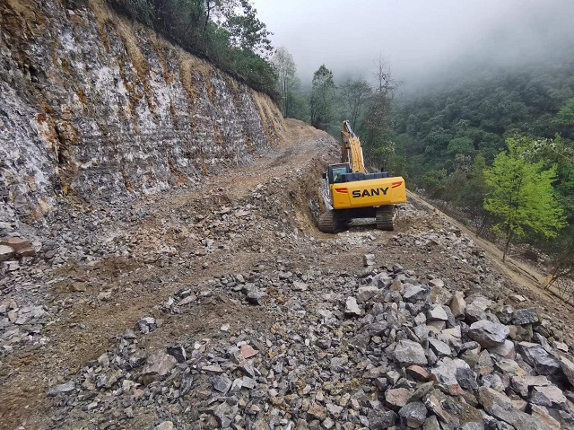 圖為河池市生態環境局指導項目實施方對三鏡巖溶洼地開展進場道路修建。