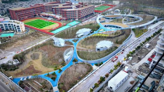 該綠地位于上海臨港滴水湖西側(cè),北鄰洛神花路,南至雪絨花路,東至白荊路,西至云皓路,南側(cè)緊鄰規(guī)劃公交首末站。建設總用地面積約56109.4平方米,項目以“立體公園、綠色碳匯”為主題進行設計施工。巧妙利用地形起伏構(gòu)建出不同高差道路,并融入周邊多個住宅小區(qū)、寫字樓以及華東師范大學附屬幼兒園、附屬中學,實現(xiàn)與環(huán)境的生態(tài)共聯(lián),并為周邊各類人群提供了地上地下豎向立體的休憩空間。同時,該綠地大規(guī)模運用環(huán)保材料與精心配置的碳匯植物,打造了綠色屋頂、透水鋪裝、雨水花園等一系列先進的海綿設施,充分發(fā)揮綠地系統(tǒng)“滲、滯、蓄”的功能,從而達到雨水源頭“凈”的目標,將景觀功能與生態(tài)功能一體化,在確保排水防澇安全的前提下,最大限度地實現(xiàn)雨水的積存、滲透和凈化,促進雨水資源的利用和生態(tài)環(huán)境保護。