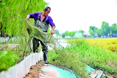 寧夏賀蘭縣立崗鎮永興村,在由鹽堿地改造而成的稻田中,工作人員在收獲稻田蟹。新華社發