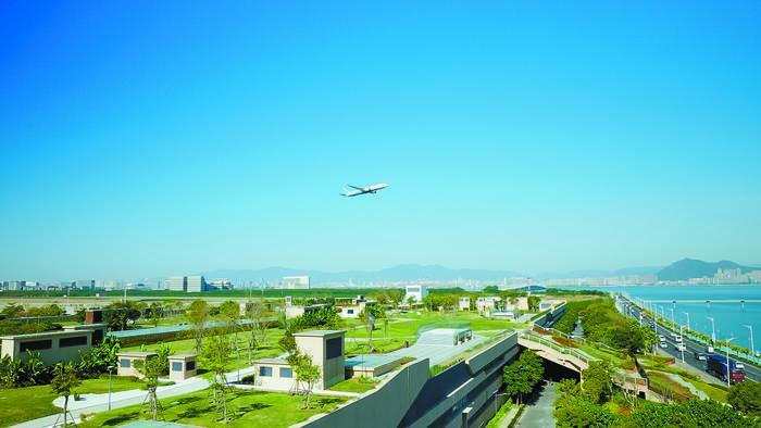 高崎水質(zhì)凈化廠位于廈門本島高崎機(jī)場以南,通過半地下集約式的建設(shè)形式,上層建設(shè)屋頂花園、中間層設(shè)為運(yùn)營維護(hù)空間、地下層布置污水污泥處理構(gòu)筑物和管道,將城市景觀、運(yùn)營維護(hù)、污水處理三大功能上下疊合,從空間上高效利用土地資源,實(shí)現(xiàn)20萬噸/日的處理規(guī)模。同時(shí),為廈門本島高崎機(jī)場T4航站樓的開發(fā)預(yù)留景觀延伸帶,將稀缺景觀資源帶給市民,構(gòu)建了“人水和諧”的全新生態(tài)空間。