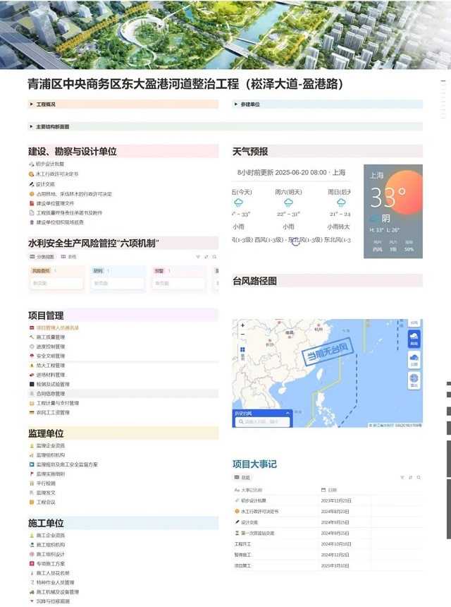 在基坑與閘室結(jié)構(gòu)施工中,項目團隊以“科技興安”理念推動安全生產(chǎn)標準化建設,通過3D建模對施工全流程進行全景模擬推演,提前預判風險點。自主研發(fā)的“項目全流程監(jiān)管系統(tǒng)”基于Notion平臺構(gòu)建,集成質(zhì)量、安全、進度等核心數(shù)據(jù)實時監(jiān)控功能,創(chuàng)新嵌入臺風預警、精準天氣預報及AI大模型風險分析模塊,實現(xiàn)從隱患排查到應急處置的全鏈條數(shù)字化管控。
