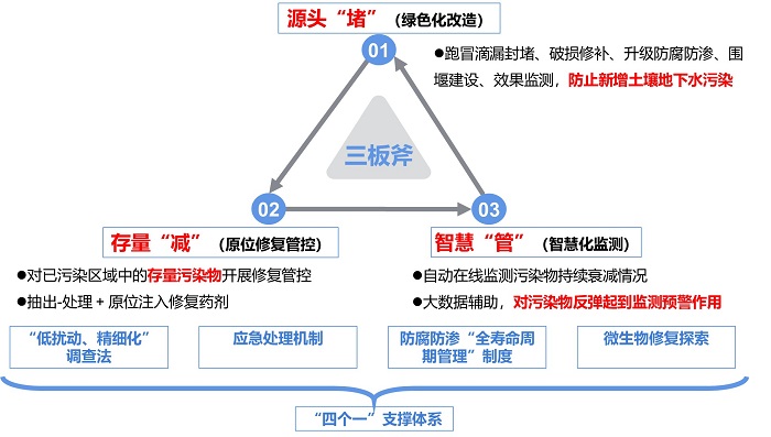 圖為忠信化工“三板斧”土壤和地下水污染源頭管控和風險防控技術體系。