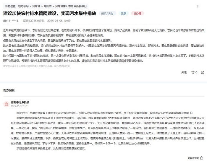 內鄉縣農業農村局在回復中坦言,鄉鎮污水處理廠雖已建成,但管網配套仍是短板。“我們正積極爭取項目,以有力的舉措扎實開展好戶廁改造工作,堅持數量服從質量、進度服從實效,求好不求快,扎實穩步推進,堅持質量第一,確保改一個成一個,讓群眾用上放心好用的廁所。”