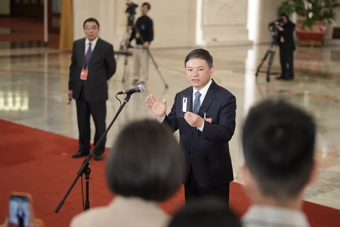 3月12日,北京,人民大會堂,十四屆全國人大四次會議第三場“部長通道”集中采訪活動,生態(tài)環(huán)境部部長黃潤秋接受記者采訪。(中青報·中青網(wǎng)記者 李雋輝/攝)